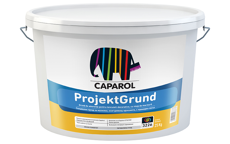 Caparol Projektgrund este un grund-vopsea alb, cu continut de nisip de marmura, cu capacitate buna de aderenta si acoperire, destinat grunduirii suprafetelor minerale portante, interioare si exterioare, cum sunt tencuielile minerale și placile de ghips-carton. In cazul placilor de ghips-carton, reduce semnificativ riscul de exfoliere a straturilor subtiri de glet pe baza de ipsos.